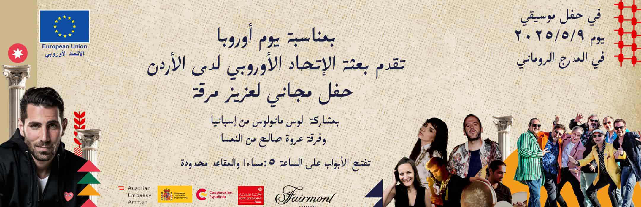 Y es que, precisamente, quien nunca se pierde esta cita es la delegación de la Unión Europea de Jordania, que año tras año organiza actos culturales a lo largo de todo el día 9 de mayo, incluyendo este 2025 un concierto en el Teatro Romano de su capital, Ammán. Un evento en el que participarán varios países y que siempre cuenta con dos invitados especiales. Siendo este año el turno de Austria y España, que serán representados encima del escenario por Orwa Saleh y Zeina Afrimos, y Los Manolos, respectivamente. Dejando la golosa tarea de cerrar la noche al artista libanés Aziz Maraka.